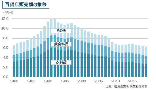 これは、家電・家具・玩具など大型専門店の勃興と国民消費生活への定着、さらには百貨店の主力であるアパレルにおいても高品質低価格のSPA業態各社の急成長など、従来百貨店が取り込んでいた消費ニーズの流出が続いたことによるものとされている。さらには、この数年はECによる購買がすっかりと定着し、百貨店という業態・ビジネスモデル自体が、歴史における役割を終えつつある、との厳しい声も聞かれる。